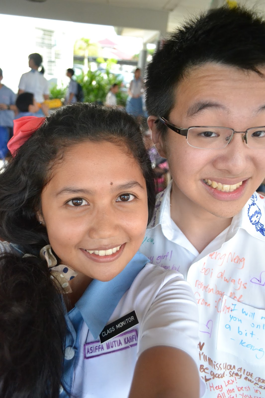 We all went back upstairs past the break time schedule because we were still scribbling on each others uniforms. We went upstairs to Geography and Add Maths class but we're not studying so meh.. Take even more pictures and students from add maths came to our class and vice versa.. Uhuhuh so good, to think about it. It sadenned me even more :(